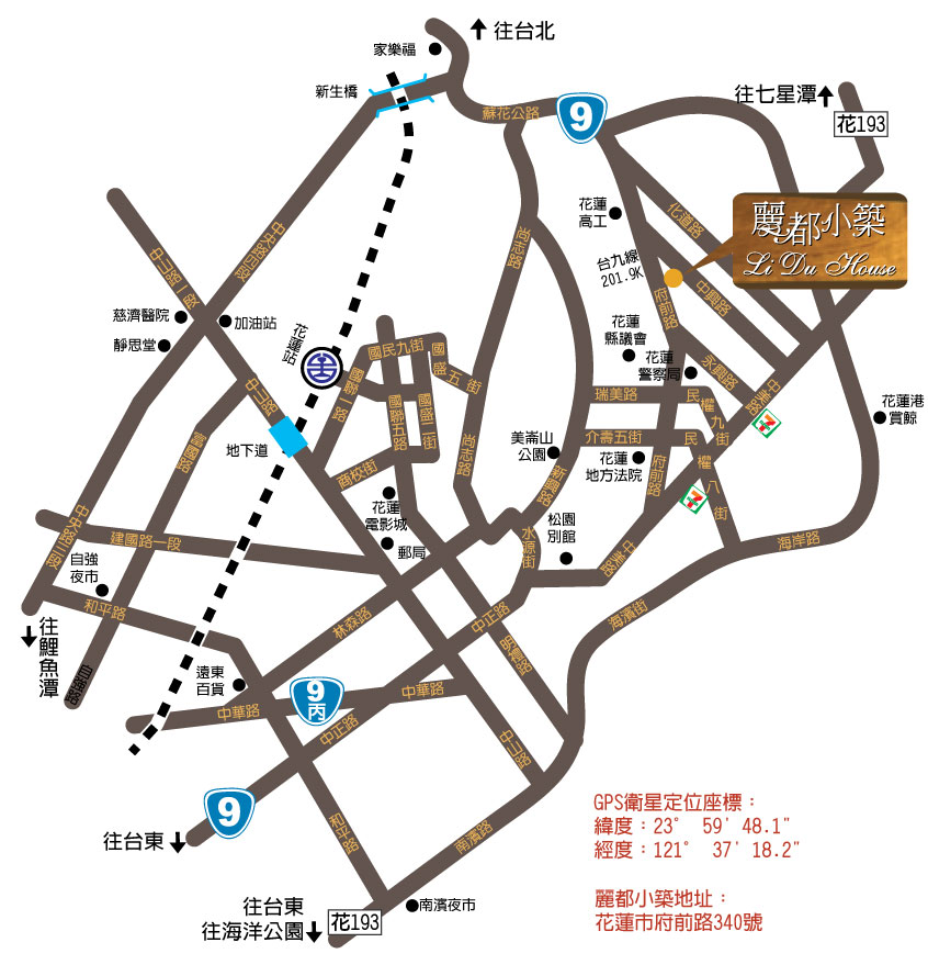 宜蘭 → 花蓮(台九省道-嘉里路) → 過家樂福前地下道直行府前路 →